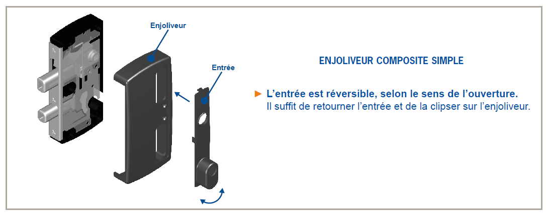 • Enjoliveur avec entrée réversible pour serrure en applique de portail battant ou coulissant