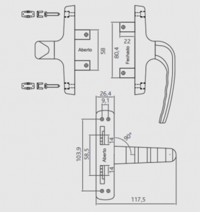 La poignée est livrée avec un entraxe de fixation de 58 mm et une hauteur totale de 193,9 mm, s’adaptant parfaitement à la majorité des portes-fenêtres standard du marché. Son levier bascule à 90°, offrant un verrouillage franc et visible.