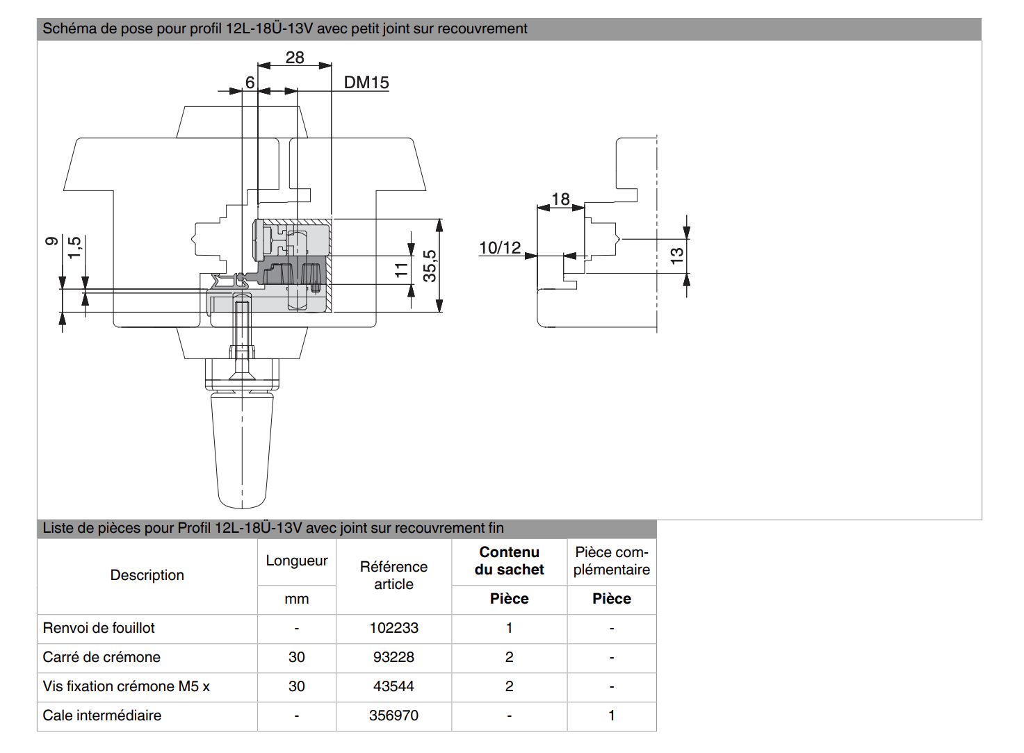 Renvoi de fouillot MACO 102233 — Jeu 12 mm · Recouvrement 18 mm · Axe 13 mm
