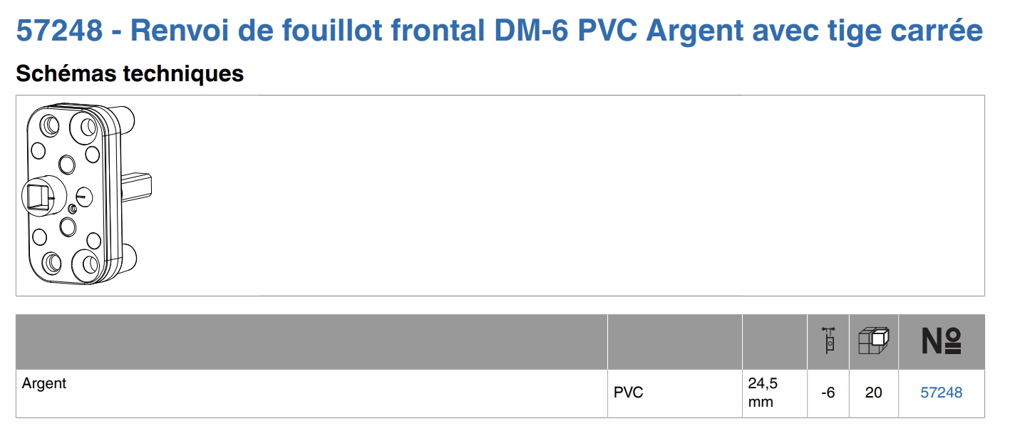 renvoi fouillot MACO 57248, renvoi de fouillot axe 13 mm, pièce MACO 57248, renvoi carré poignée 7 mm MACO, réglage fouillot MACO, renvoi MACO déport 13 mm
