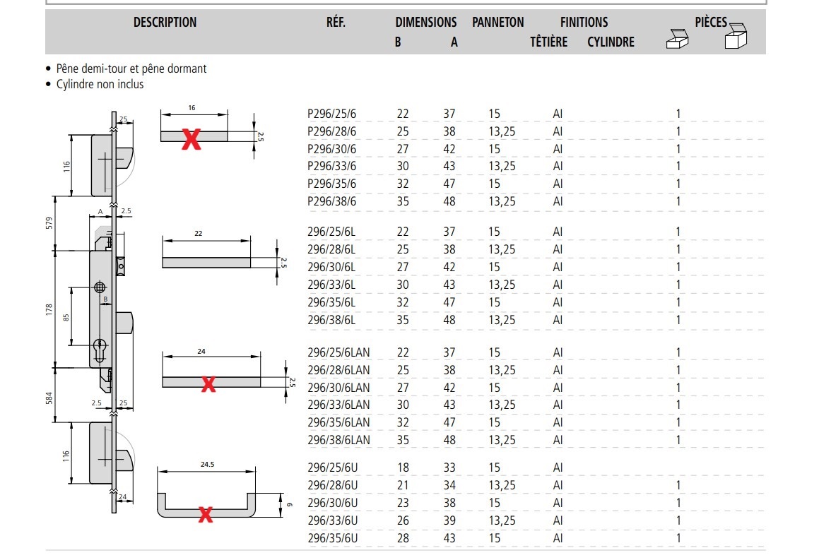 Serrure CVL 3 points pêne basculant entraxe 85mm série 296 TT22
